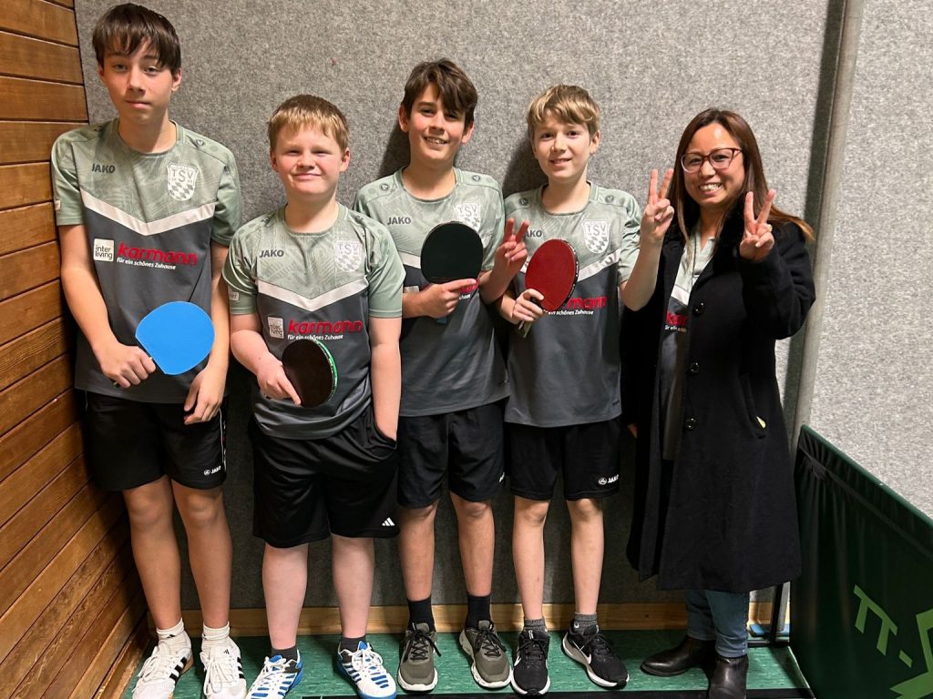 Philipp Gritschneder, Elia Zach, Leon Schirmböck, Theo Beck und Betreuerin Neetu Rasaily-Dennerlöhr nach dem Auswärtssieg in Nordendorf Weiter geht es für die dritte Jugend am Samstag, 14. Februar in eigener Halle gegen den ebenfalls siegreich in die Runde gestarteten SV Adelsried. Am gleichen Tag greift dann auch die in die Bezirksklasse A hochgestufte erste Jugend mit einem Auswärtsspiel beim TSV Nördlingen IV wieder in den Spielbetrieb ein.