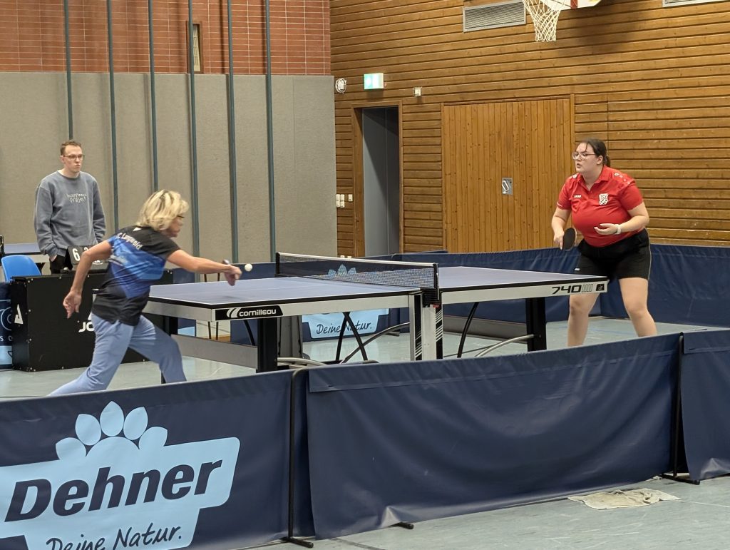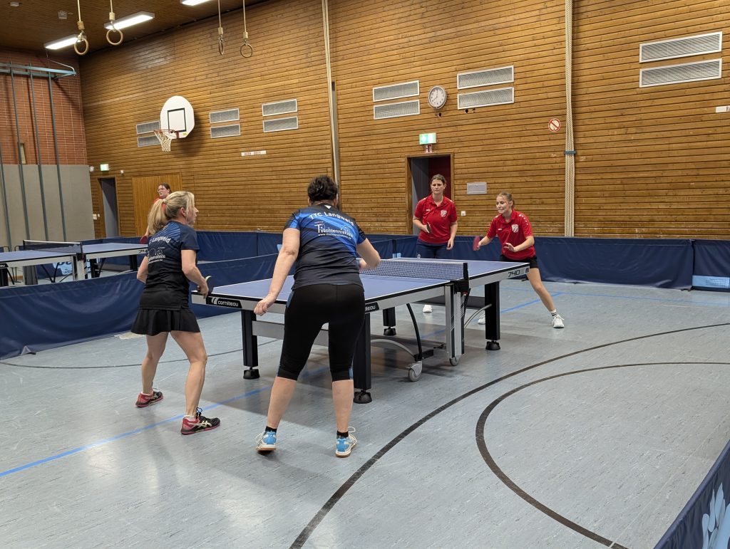 Annika Jung und Emma Krämer punkteten gegen Langweid im DoppelAnschließend erhöhten Emma Krämer mit einem Fünfsatzsieg über Marianne Förg und Annika Jung, die Sabine Schmitt sicher in drei Sätzen bezwang. Doch nun kamen die routinierten Langweiderinnen besser ins Spiel: Bettina Stang fand gegen Dahna Behnisch nicht richtig in die Partie, Sara Schindler zollte gegen Sabine Schmitt ihrer fehlenden Wettkampfpraxis Tribut. TSV-Spitzenspielerin Jung erhöhte durch ihr 3:0 über Behnisch zwar zum 4:2-Zwischenstand, doch im Endspurt klappte bei den Gastgeberinnen nicht mehr allzu viel. Schindler unterlag trotz guter Ansätze auch Förg, Stang war gegen Schmitt nahe an der 2:1-Satzführung, um schließlich 1:3 zu verlieren, und Krämer ging es gegen Behnisch ganz genauso. So war es Annika Jung vorbehalten, mit ihrem souveränen 3:0 über Förg zumindest das Unentschieden zu retten und nebenbei ihre Einzelbilanz auf 24:0 (plus 4:0 bei zwei Einsätzen in der Vierten) auszubauen.