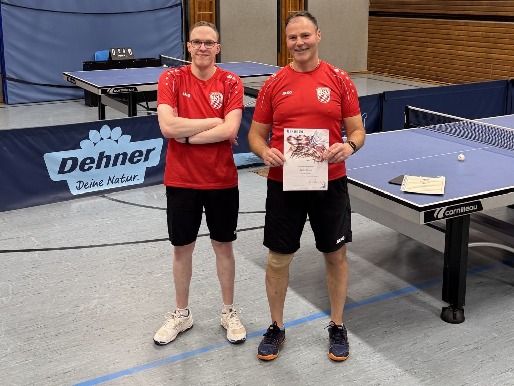 Für 30 Jahre aktiven Tischtennis-Sport wurde Martin Reisner vor dem Heimspiel gegen Mertingen von Mannschaftsführer Max Bleimayr (links) geehrt