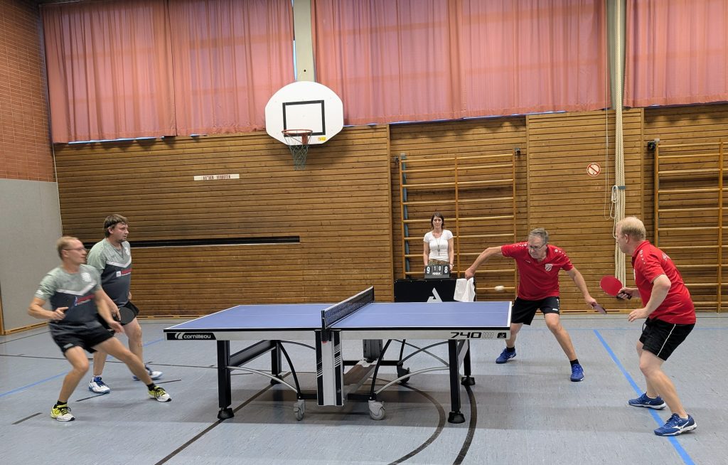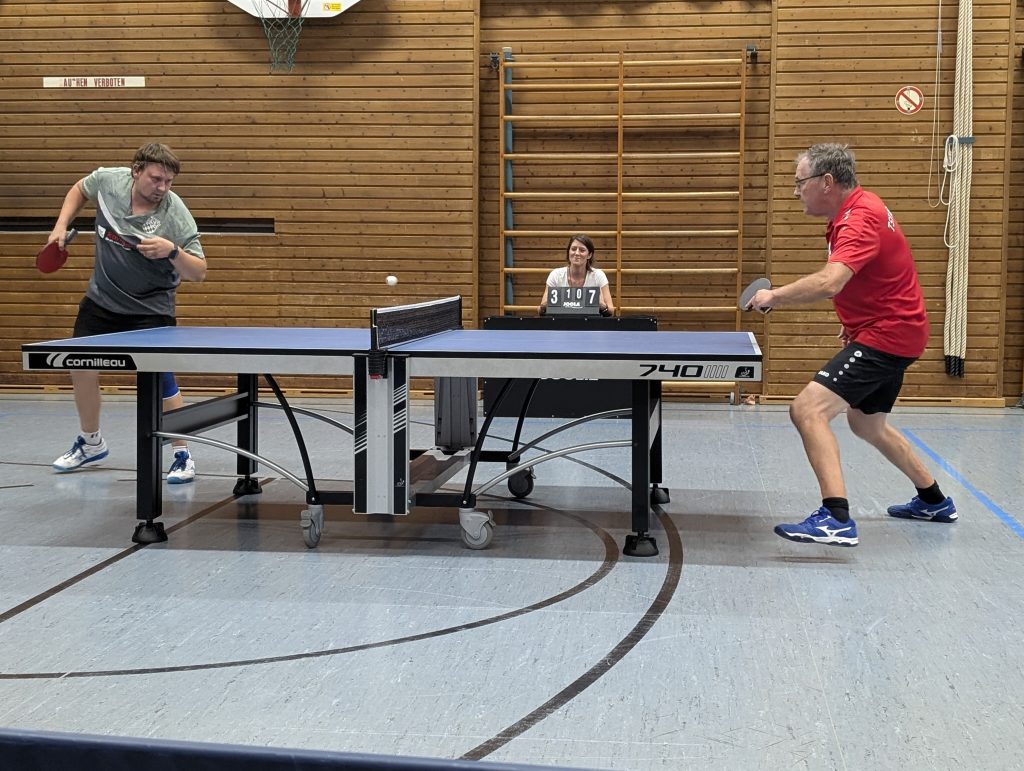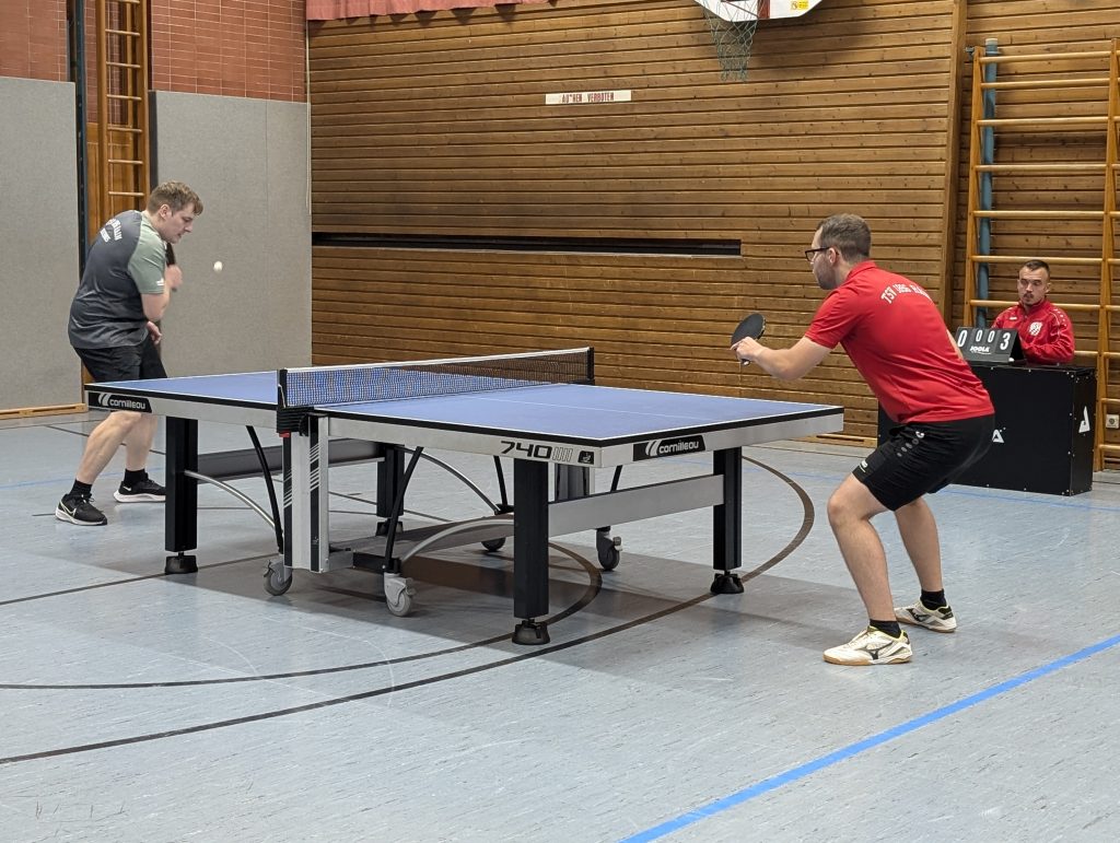 Und wer weiß, wie die Partie ausgegangen wäre, hätten nicht Römer/Grob ihr Doppel hauchdünn mit 11:13 im Entscheidungssatz gegen Wittmeier/Klein verloren – parallel dazu setzten sich nämlich Weirich/Simonis mit einem ganz starken Auftritt in vier Sätzen gegen Genz/Nothofer durch. Knappe Satzausgänge prägten auch die ersten Einzel im vorderen Paarkreuz. Während Marco Klein dabei in vier Sätzen Sieger gegen Wolfgang Römer blieb, verlor zeitgleich unerwartet Gerhard Wittmeier ebenfalls mit 1:3 gegen Eduard Weirich. Davon sichtlich beflügelt, liefen im hinteren Paarkreuz Thomas Simonis und Andreas Grob zur Hochform auf: Gegen Matthias Nothofer und Jürgen Genz ließen die beiden Akteure der Zweiten keinen einzigen Satz liegen.